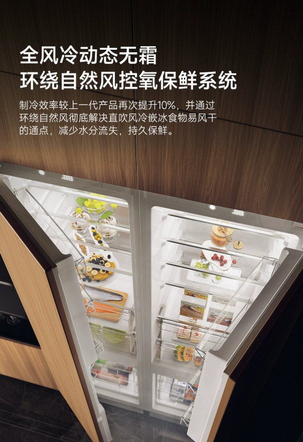 科学分区,贴合烹饪动线:创新 “左即食、右烹饪” 分区逻辑,冷藏区存放果蔬、乳制品等即食食材,冷冻区收纳肉类、冻品等烹饪原料,拿取无需反复翻找,同时减少开关门导致的温度波动,兼顾效率与保鲜。